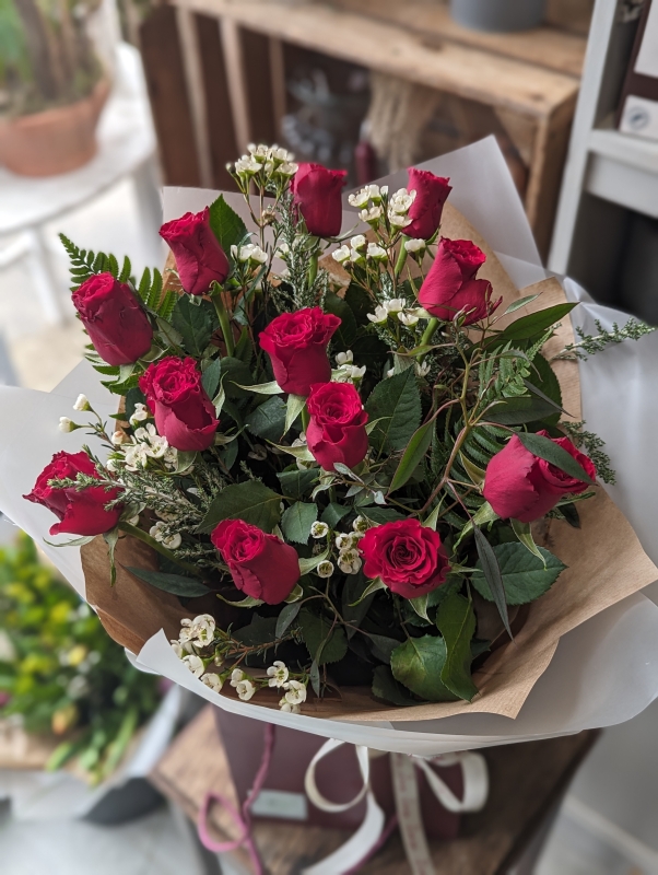 A beautiful bouquet of luxury, long stem roses with mixed seasonal foliage. A perfect bouquet for a loved one.