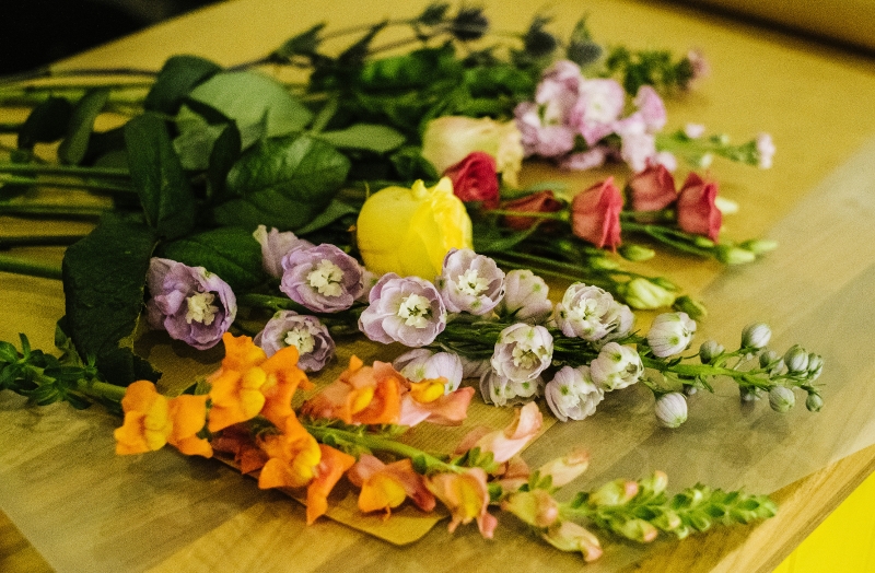 A bouquet of seasonal flowers standing in a cellophane reservoir of water and placed in a presentation box. Perfect for anyone who may not have time to find a vase straight away.