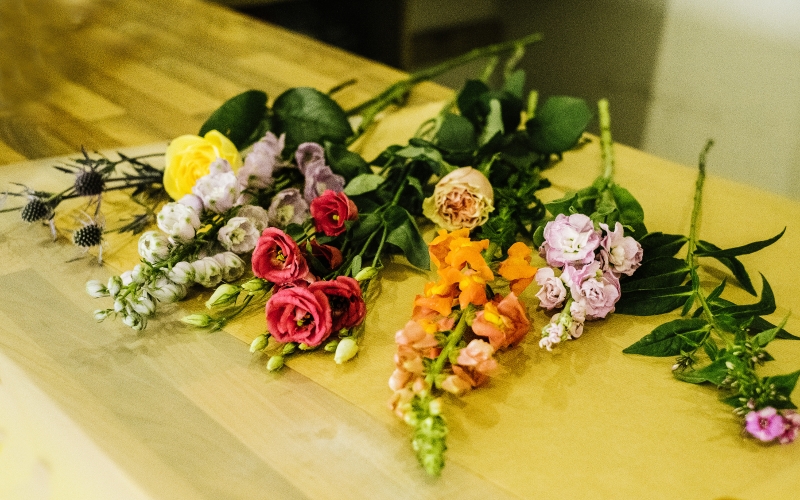 A bouquet of seasonal flowers professionally arranged and tied. With bare stems ready for the recipient to add straight into their own vase.