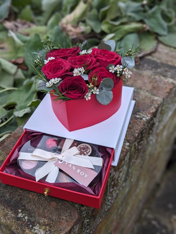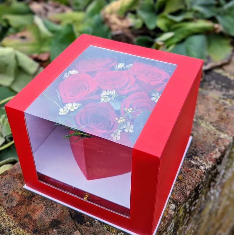 Our valentines gift box contains a heart shaped arrangement of 6 large headed red Roses.