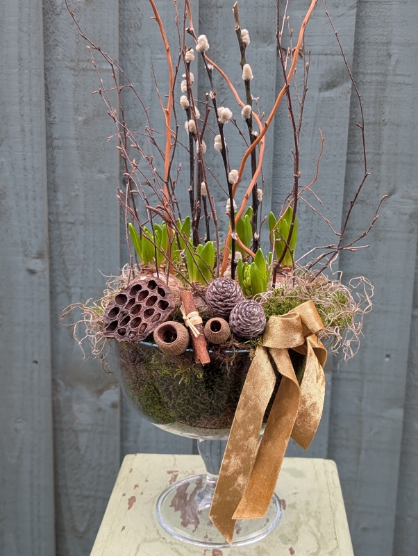 A beautiful glass footed bowl filled with white hyacinth bulbs and moss. finished with natural decorations and twigs.