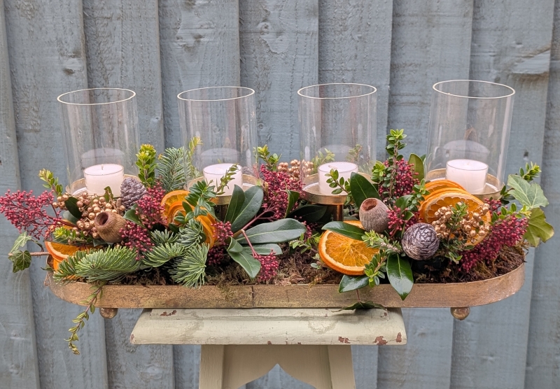 A stunning golden candle holder decorated with Christmas foliage, berries and fruits.