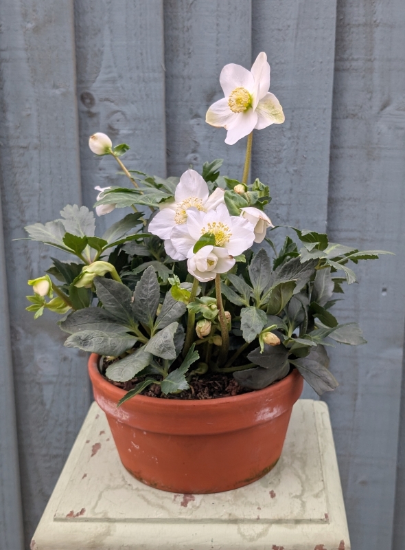A stunning white Hellebore (Christmas Rose) planted in a weathered terracotta bowl.