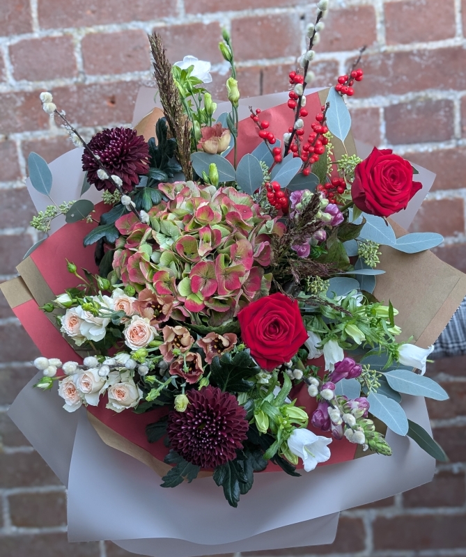 A stunning bouquet in Christmas reds and greens.