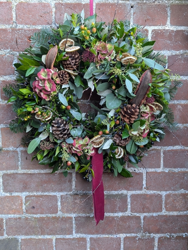 A beautiful handmade wreath on a biodegradable base. Filled with mixed winter foliage, berries and natural dried fruit and nut decorations.