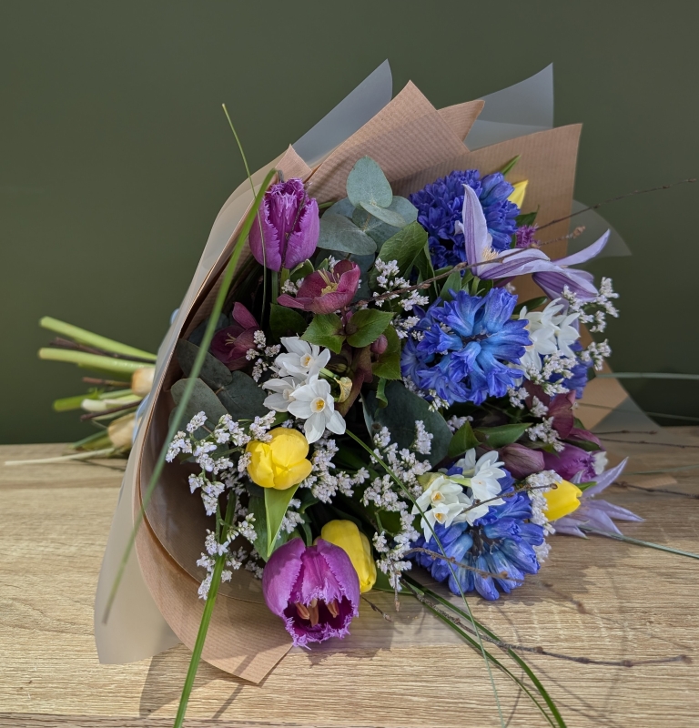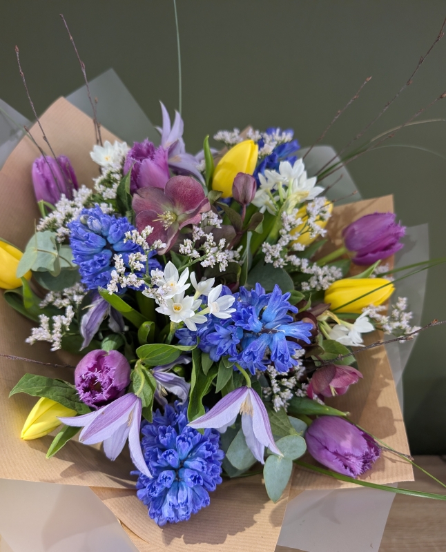 A beautiful spring bouquet in blues, whites, yellows and lilacs.