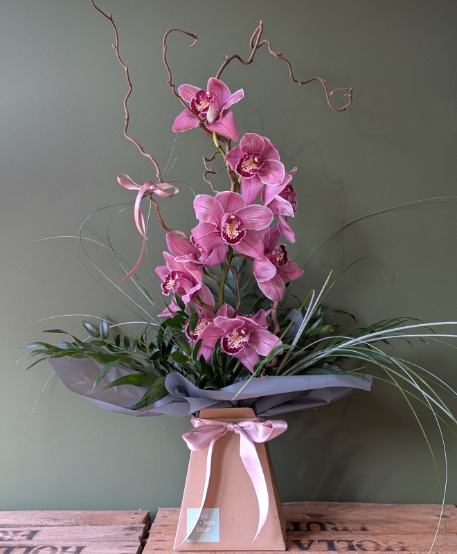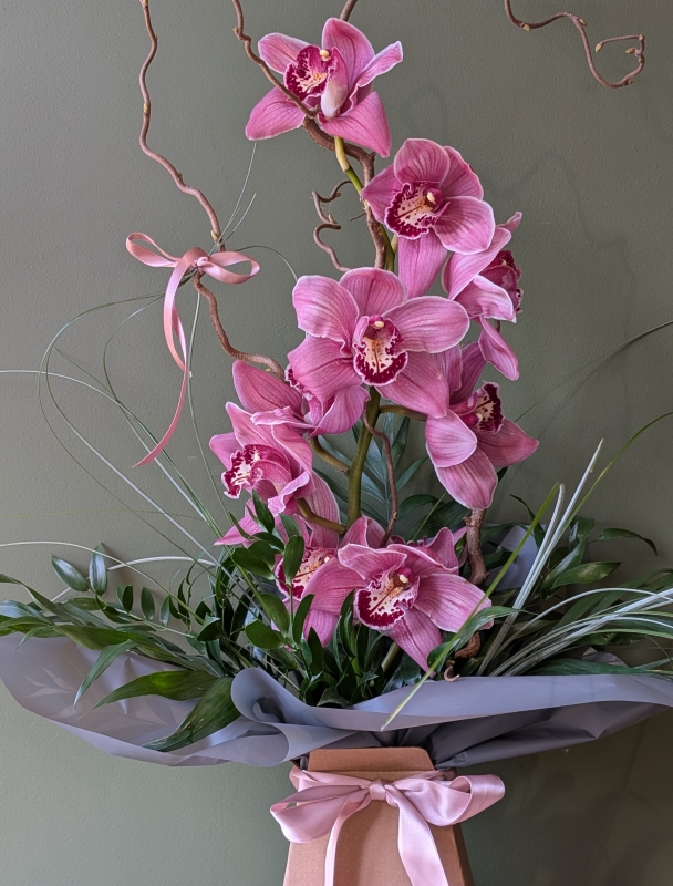 Something a little different. A luxury cut orchid stem accompanied by hazel branches, palm leaves and beargrass trails.