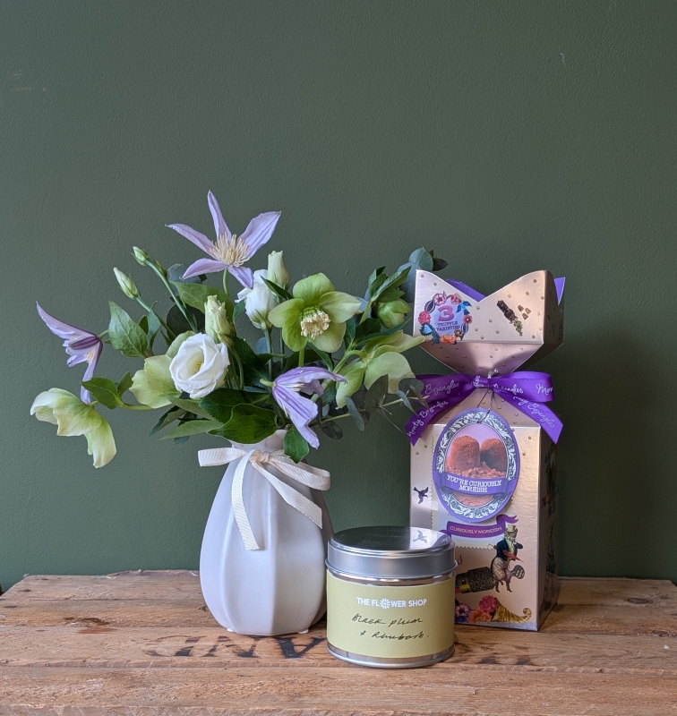 An adorable vase filled with soft spring flowers, accompanied by a box of Monty Bojangles truffles and a scented candle.