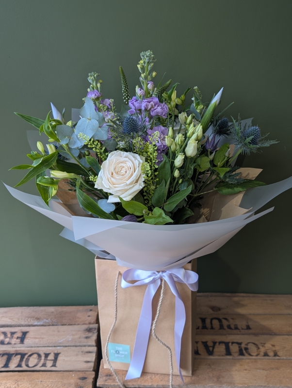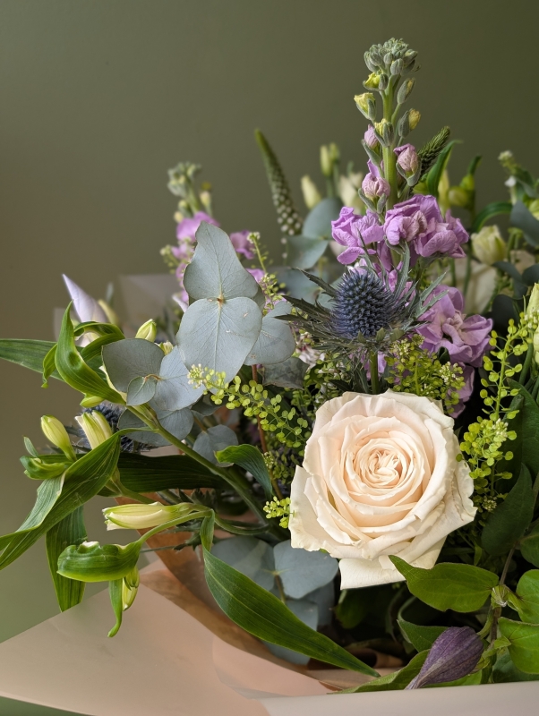 A beautiful purple/ lilac and white bouquet in cottage garden blooms.