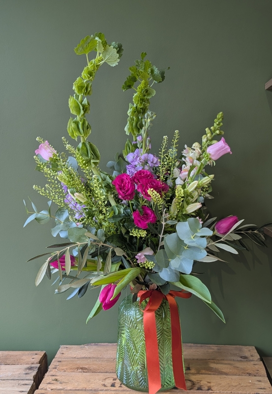 A beautiful vase arrangement in dark pinks, lilacs and limes.