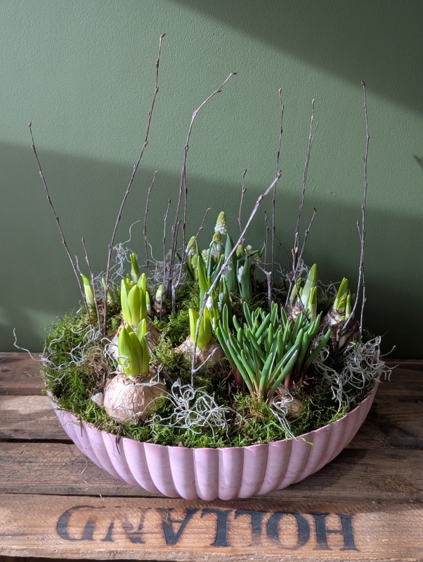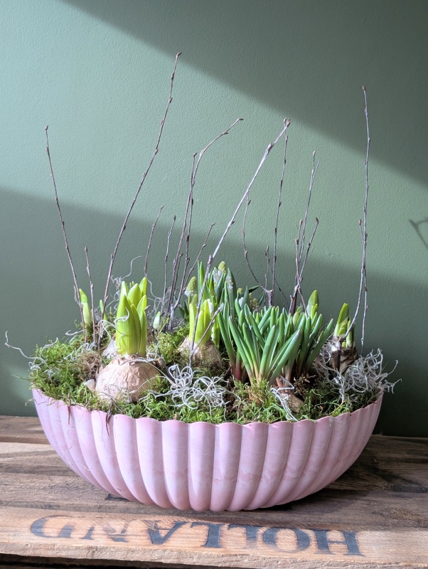 A beautiful soft pink scalloped dish filled with scented bulbs. Ready to bloom and fill the home with sunny Narcissi and scented miscari.